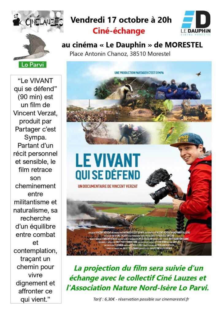 -> Le synopsis : “Le VIVANT qui se défend” (90 min) est un film de Vincent Verzat, produit par Partager c’est Sympa. Partant d’un récit personnel et sensible, le film retrace son cheminement entre militantisme et naturalisme, sa recherche d’un équilibre entre combat et contemplation, traçant un chemin pour vivre dignement et affronter ce qui vient.”